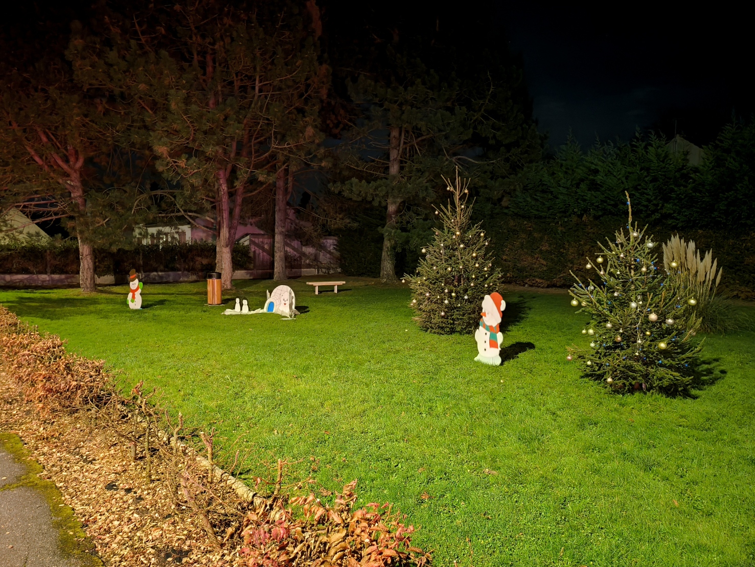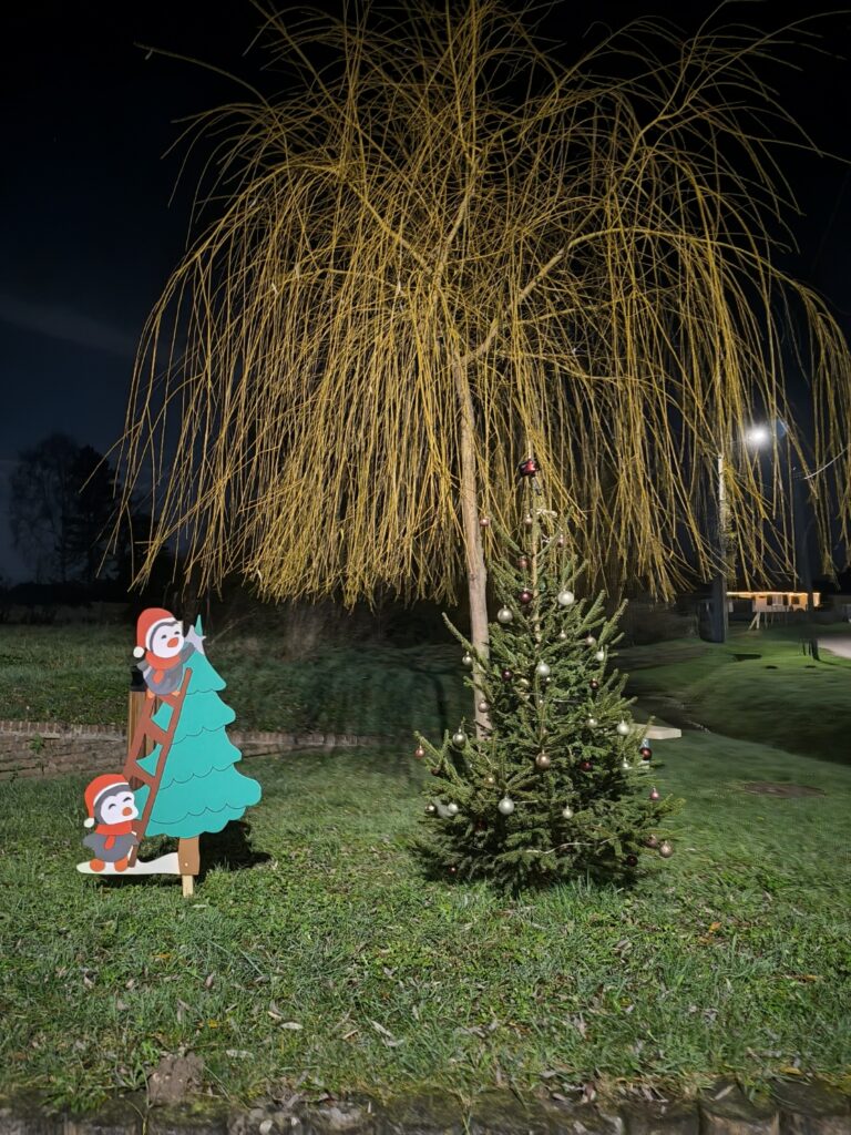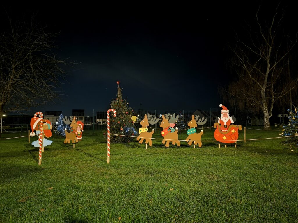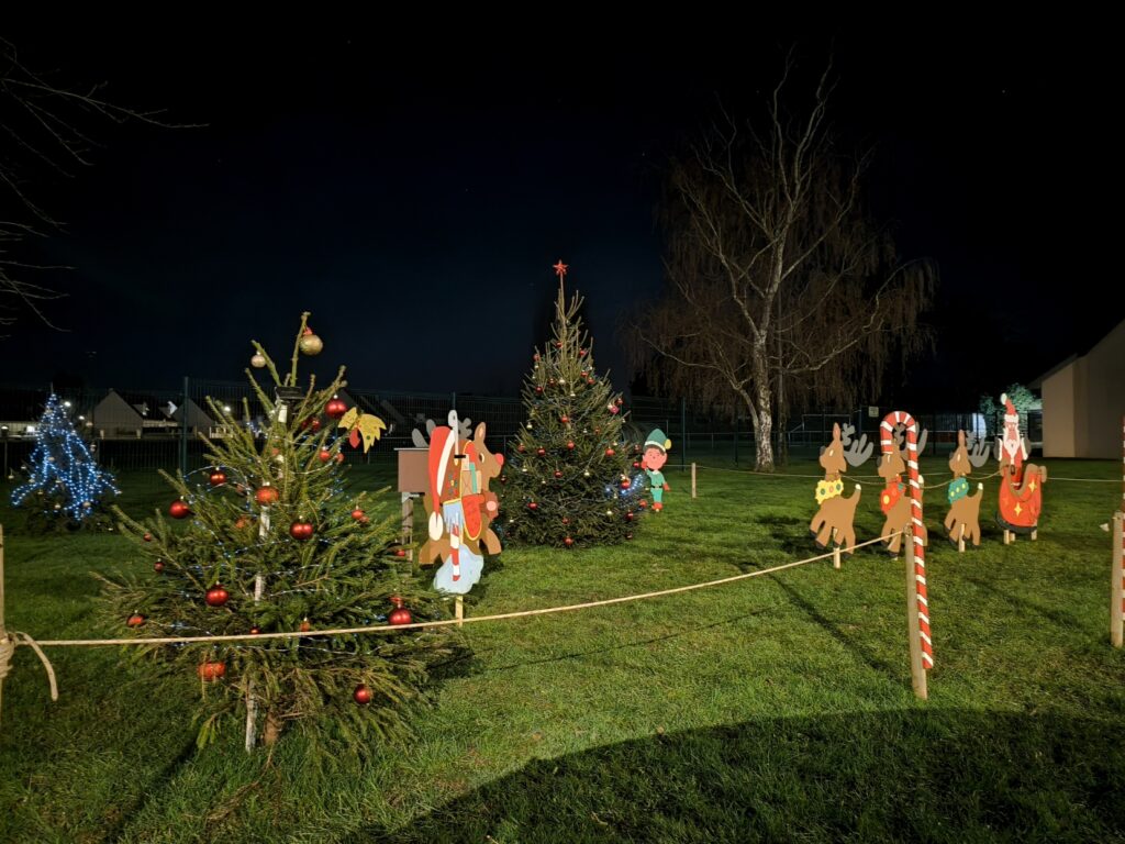 - Ambiance Noël – Décoration dans le village (sapins et personnages) avec la boîte aux lettres du Père Noël