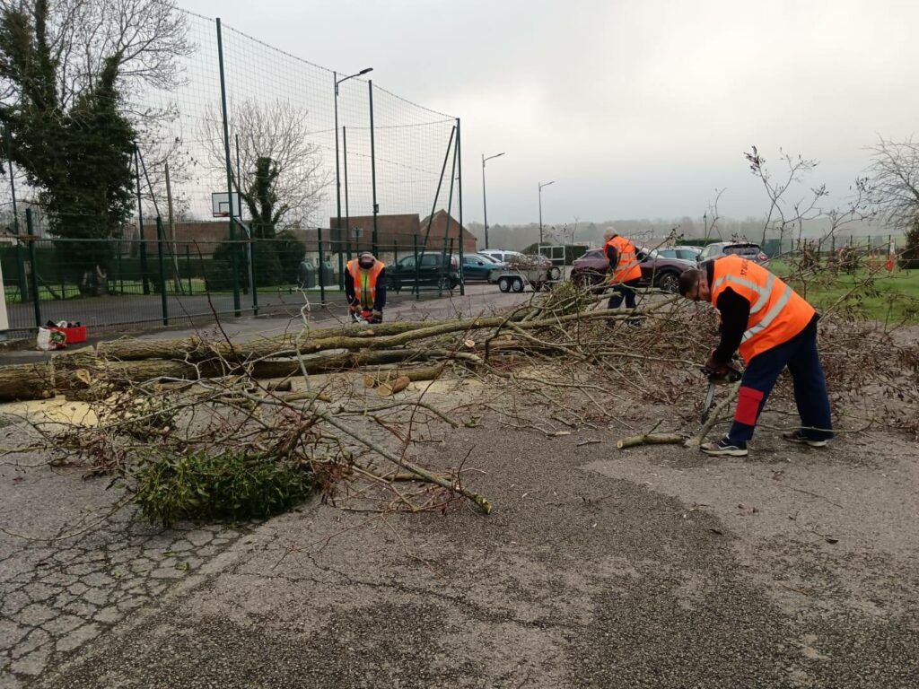 Beaucoup de travail encore avec la destruction du mur qui sépare l’aire de jeux et la future mairie. Arrachage de haies et d’un arbre dangereux.