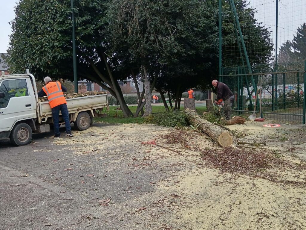 Au programme de cette matinée : Au square des pins, la haie de charmille a été nettoyée et arrosée. Un arbre a été coupé et débité car il était en mauvaise santé.